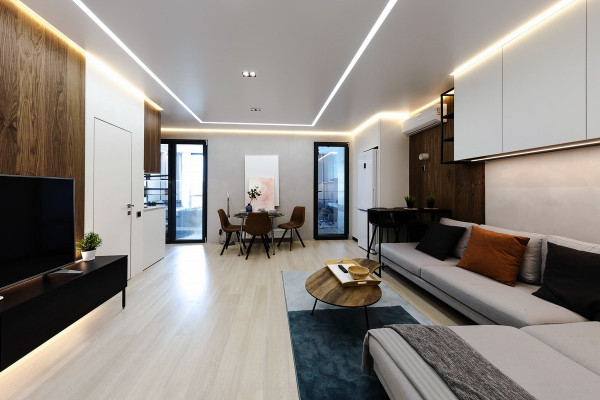 - Зонируют комнату за счет световых полос, пробивающихся между потолочными уровнями;