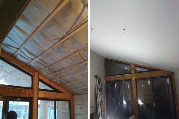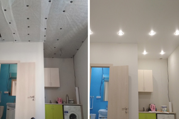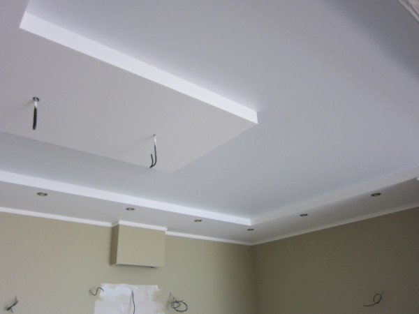 Это поливинилхлоридная пленка (ПВХ), натянутая на несколько сантиметров ниже черновой поверхности на профили из пластика или алюминия, в зависимости от типа которых отделка будет без щелей, с теневым зазором или традиционно с потолочным плинтусом.
