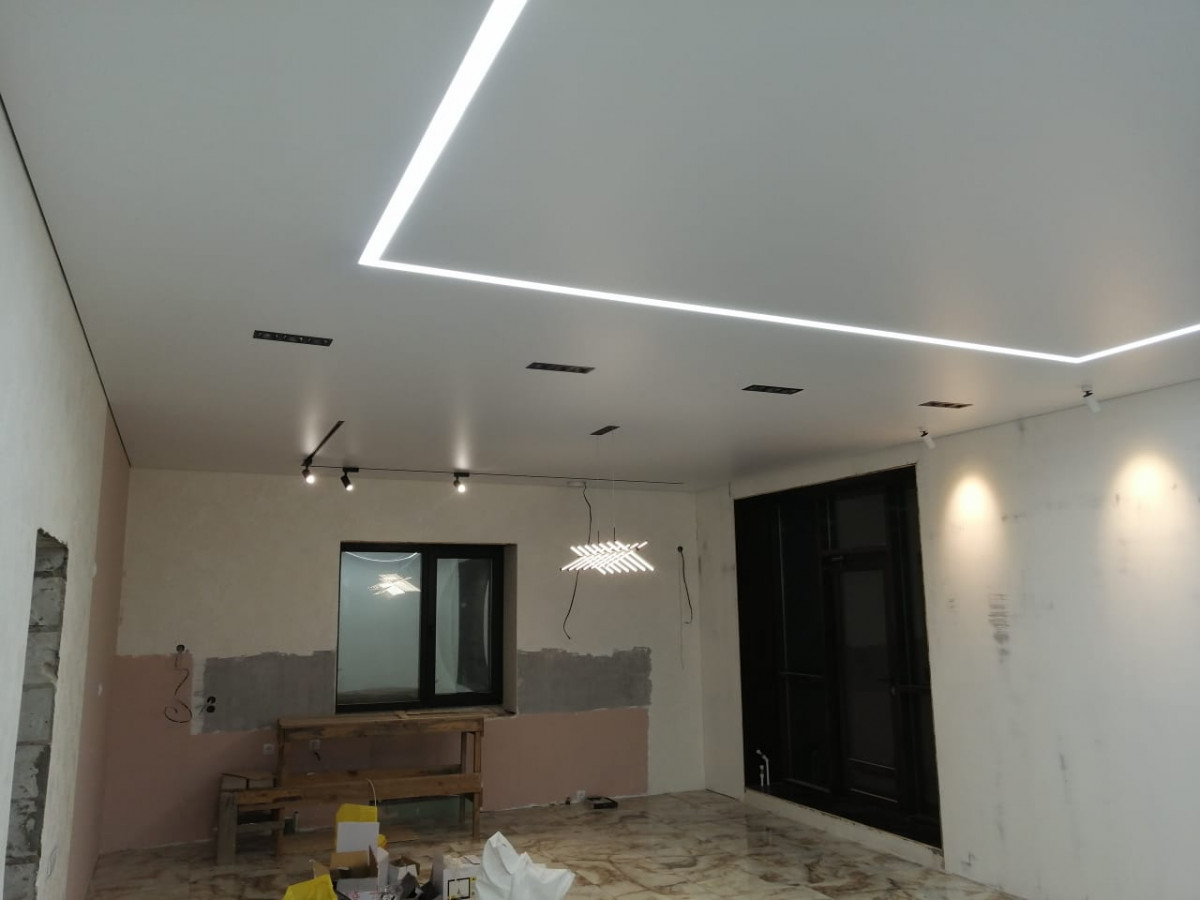 - После того, как проект размещения световых линий на натяжном потолке готов, мастер приступает к установке специальных профилей. Именно в них в последующем будут вмонтированы линии.